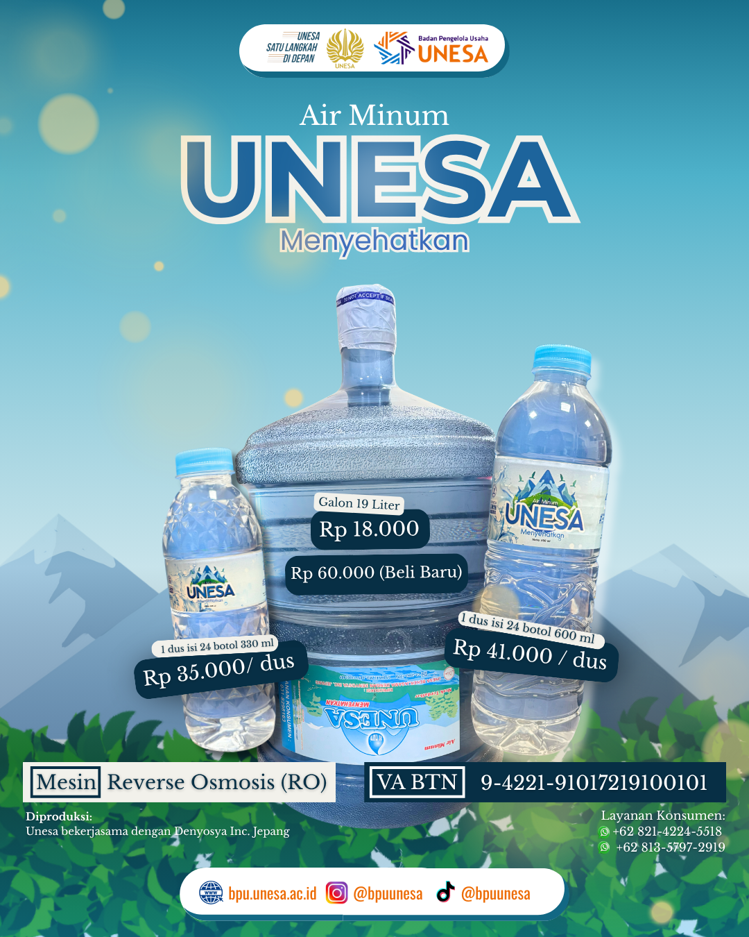 Air Minum Unesa memiliki keunggulan dibandingkan air minum dalam kemasan (AMDK) lain yang ada di pasaran. Keunggulannya adalah Air Minum Unesa hasil dari proses RO (Reverse Osmosis). Dilansir dari laman University of Nebraska-Lincoln AS , filter membran RO digunakan untuk mengurangi tingkat partikel berbahaya (seperti ion/logam, pestisida,dan radioaktif nuklida) yang tersuspensi dalam air dan tidak dapat dihilangkan pada proses filtrasi biasa. Dengan demikian, Air Minum Unesa lebih segar dan menyehatkan. Air Minum Unesa disajikan dalam kemasan botol plastik berukuran 330 ml dan 600 ml yang sangat praktis untuk dibawa bepergian maupun disuguhkan sebagai konsumsi rapat atau kegiatan lain dalam ruangan. Selain itu, Air Minum Unesa juga dikemas dalam galon 19 Liter untuk menunjang kegiatan dalam ruangan.